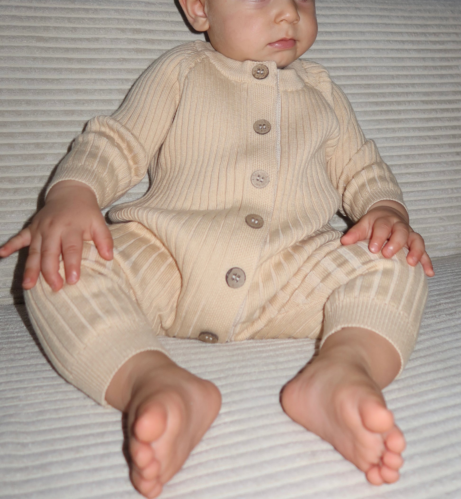 Onze ribgebreide boxpakje in de kleur Zand is gemaakt van zacht, ademend katoen voor maximaal comfort. Dankzij de slimme magnetische sluitingen gaat het aankleden moeiteloos – één klik en je kleintje is klaar. Geen gedoe meer met kleine drukknoopjes maar snel en soepel omkleden, ook tijdens nachtelijke verschoningen.